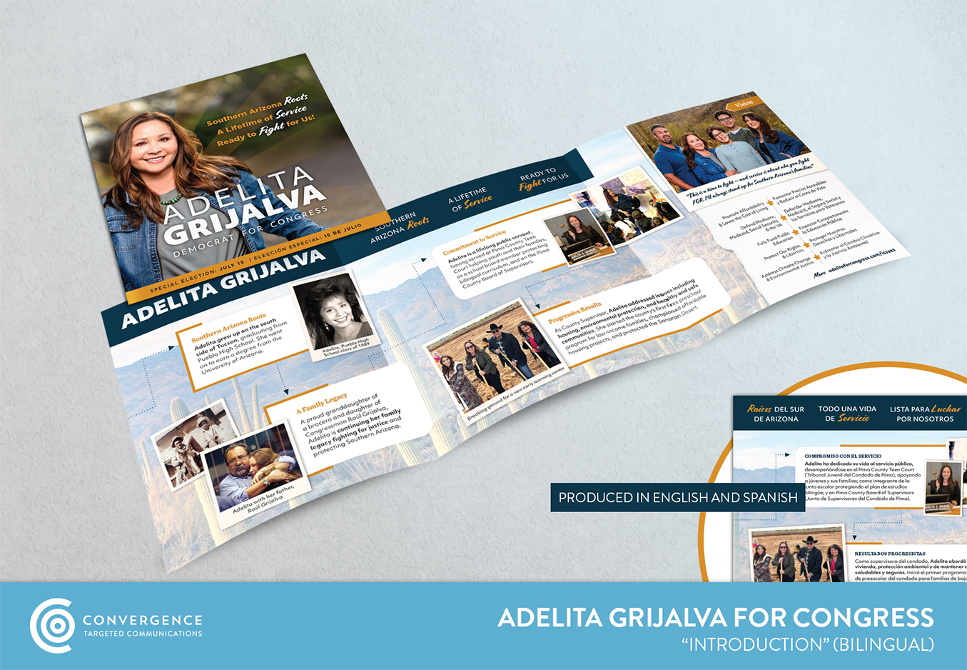 The 2025 special election for Arizona’s Seventh Congressional District featured a competitive multi-candidate field and involved communicating with voters in a district with among the highest rates of Spanish spoken at home in the United States. Convergence worked with the Grijalva campaign to produce direct mail that varied its format across the district – fully bilingual in some parts and predominantly English with some Spanish-language elements in others. Additionally, we produced an entirely Spanish-language version of every direct mail piece for use online, allowing the campaign to promote them as an option for voters who preferred to read in Spanish. This tactical approach, which significantly broadened the reach and effectiveness of our direct mail, combined with a powerful message of connection to the district, experience as a progressive leader, and a willingness to fight for the people of the Seventh district. Grijalva won her primary and general elections decisively.